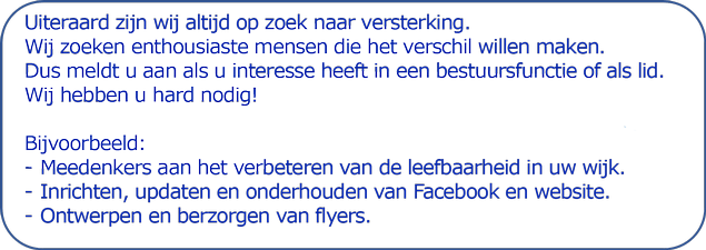 - steunen we initiatieven van bewonersgroepen om gezamenlijk te werken aan prettig wonen - leven en nemen we zo nodig zelf initiatief;