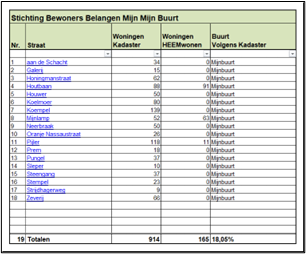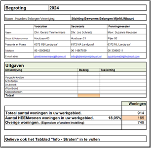 In augustus - September dienen de aangesloten HO's en BC's de gespecificeerde begrotingen voor het komende jaar in te leveren bij het secretariaat van het CHOH. Hierbij dient ook het aantal HEEMwonen woningen in het betreffende wooncomplex, de straat, buurt of wijk te worden vermeldt. Zie het bijgevoegde voorbeeld.
