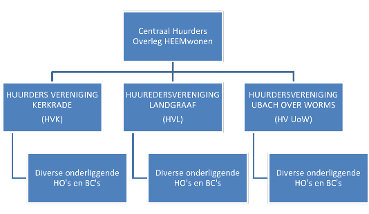 De woningcorporatie HEEMwonen is actief in Kerkrade en Landgraaf. Dit is het werkgebied van HEEMwonen en is opgedeeld in een vijftal zogenaamde stadsdelen. Kerkrade kent de stadsdelen Kerkrade-Oost en Kerkrade-West en Landgraaf kent de stadsdelen Nieuwenhagen, Schaesberg en Ubach over Worms. Elk van de stadsdelen kent een organisatie die de belangen van de huurders behartigt. Het Centraal Huurders Overleg HEEMwonen (verder het CHOH genoemd) is de vereniging van 3 op centraal niveau samenwerkende huurdersverenigingen. In november is de nieuwe huurdersvereniging Landgraaf (HVL) opgericht, deze nieuwe vereniging vertegenwoordigen de huurdersbelangen van de stadsdelen Schaesberg en Nieuwenhagen. Huurdersvereniging Ubach over Worms blijft de belangen behartigen voor de huurders van het stadsdeel Ubach over Worms.